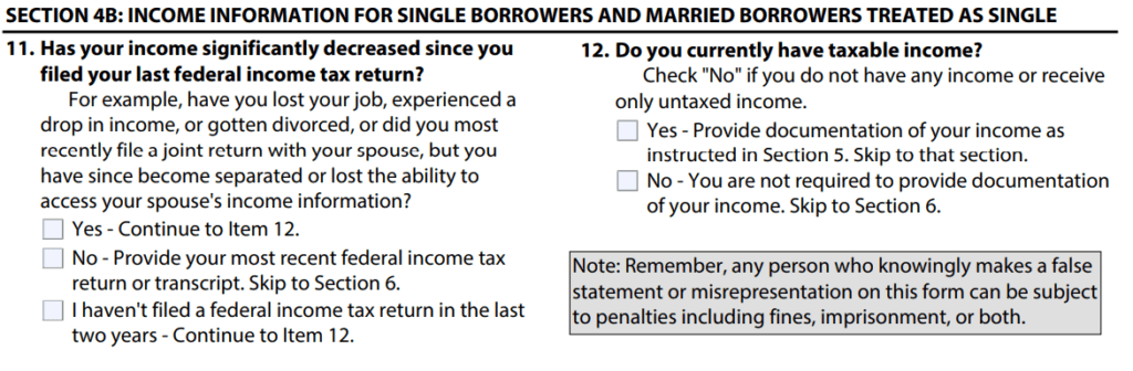 The recent update to the IDR Plan Request form makes the income documentation algorithm a little easier to navigate. The income sections (4B, 4C, 4D) ask: “Has your income significantly decreased since you filed your last federal income tax return?” Notice the small, yet significant, difference? Instead of wondering what to do if your income has increased, you now can more comfortably use your most recent tax return unless your current income is less than the AGI from your most recent tax return.